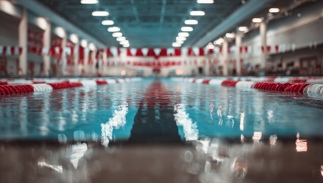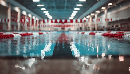 Serene indoor swimming pool with lanes and red-white markers, soft light