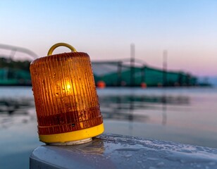 A traditional floating aquaculture fish farm features a marker light installed  across the calm water