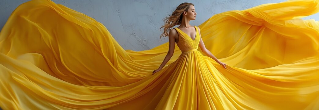 Dancing in a golden silk dress, a chic lady soars on the wind.  In a yellow gown, a stunning model waves against a grey backdrop.