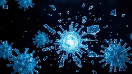 A microscopic view of shattered blue viruses floating against a dark black space background scene rendering