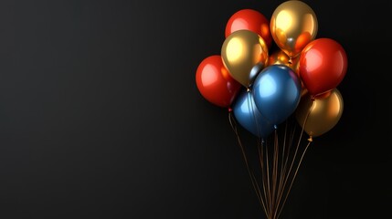 Colorful 3d illustration of floating birthday balloons in various shapes and sizes on black background