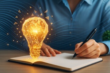 Person writing in notebook with glowing polygonal light bulb floating above, symbolizing innovative business ideas and creativity concept.