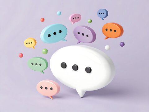 Colorful 3d speech bubbles and dots floating around a large white chat balloon