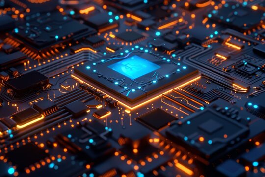 a circuit board with orange and blue glowing lines and numbers floating above it.