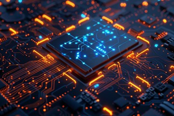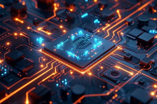 a circuit board with orange and blue glowing lines and numbers floating above it.