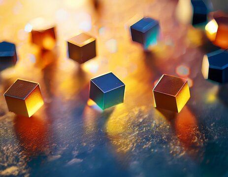 colorful hexagon and cube shapes floating over textured surface with warm glow and soft bokeh