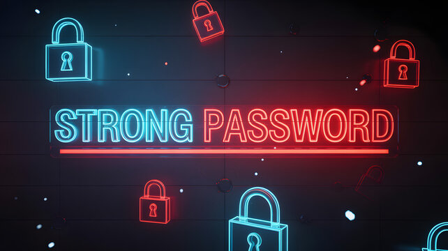 Neon strong password sign with floating padlocks in red and blue on a dark background with particles