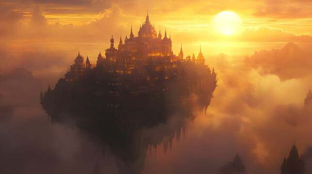 floating palace surrounded by mist, reflecting golden light from the setting sun