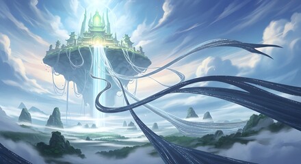 Surreal futuristic palace on a floating island with glowing energy cables extending across a cloudy sky. Suitable for fantasy, sci-fi, and imaginative settings.