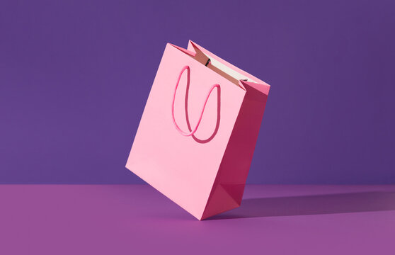 Pink flying paper shopping bag on purple background. Shopping sale delivery concept