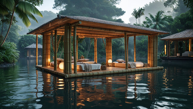 Tranquil tropical retreat bamboo pavilion floating on water with lush greenery