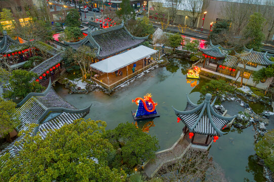 Aerial view of traditional Chinese architecture reflected on a pond with floating dragon, lantern, and lush greenery, Lan Su Chinese Garden, Portland, Oregon, United States.