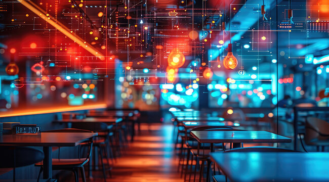 Responsible innovation restaurant, technology and data points floating in foreground and background, vibrant blues and reds, fast food restaurant scene in background.