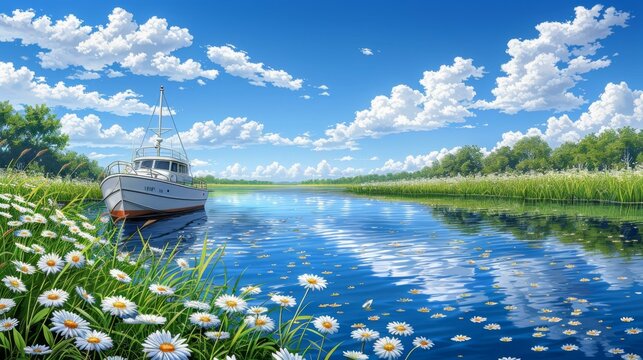 A boat is floating on a calm lake, surrounded by a field of flowers. The scene is serene and picturesque, with the boat providing a focal point in the image.