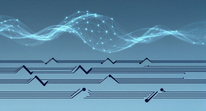 Futuristic cityscape with glowing circuit grid at dusk