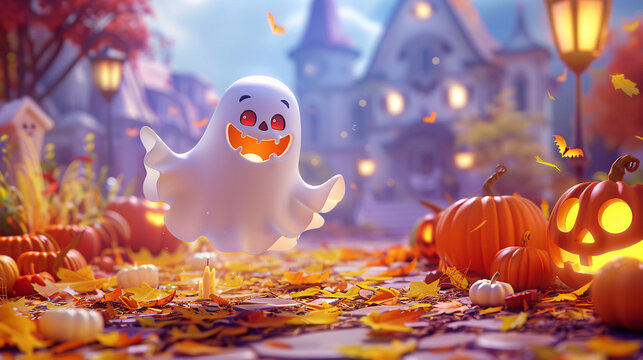 Full-body 3D cartoon ghost with a friendly smile, floating among animated pumpkins and Halloween decorations in a colorful, high-resolution scene