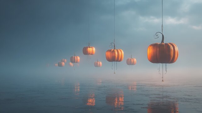 Eerie pumpkins suspended over water in a foggy halloween night landscape