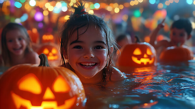 Happy Halloween Fun - Kids Bobbing for Apples in a Festive Pool