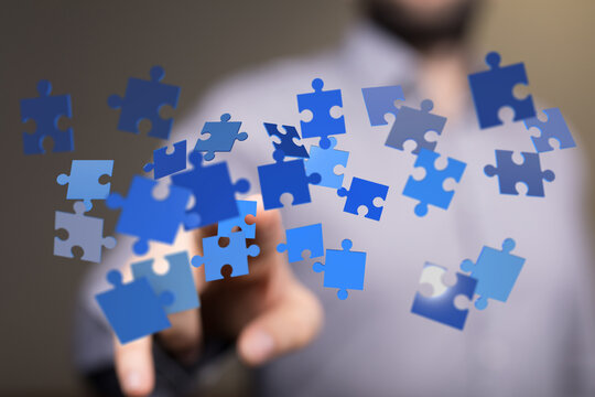 Conceptual image of a hand interacting with floating puzzle pieces, representing concepts like teamwork, strategy, solutions, and collaboration.