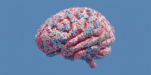 Brain Puzzle Made of Interlocking Pink, Blue, and White Pieces Representing Complex Thought and Creativity