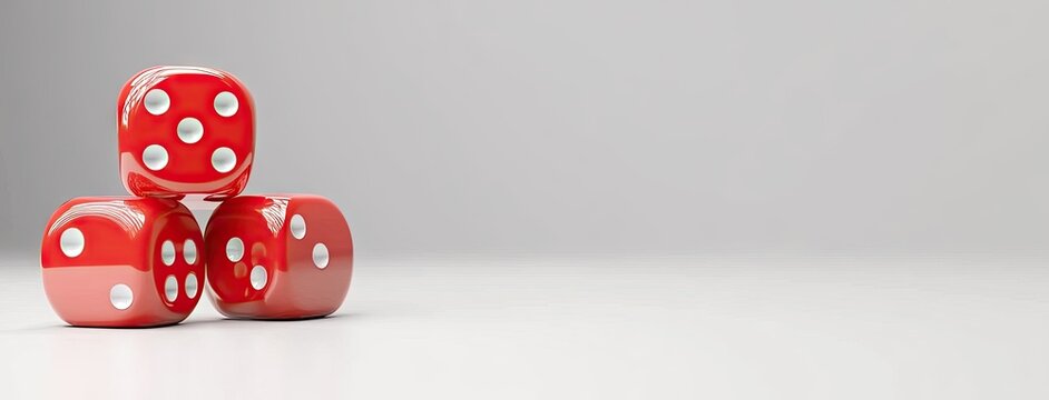 Multiple glossy red dice with white dots floating in the air, realistic graphic style on a light background, concept of chance and gaming. Ai generative
