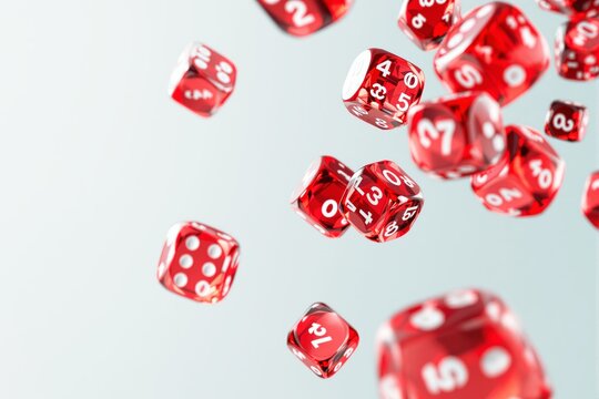 Floating red translucent dice with various numbers on a light background.