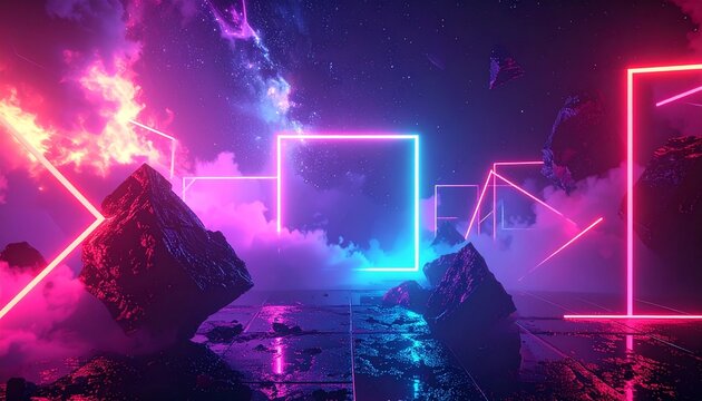 Glowing neon shapes float in dark space with geometric forms and rocks