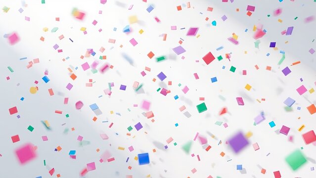 Floating colorful squares, rectangles drifting across gray gradient field, with confetti elements