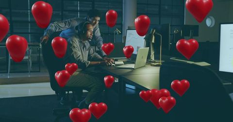 Two men sitting on sofa with floating red hearts and laptop, social media dating concept