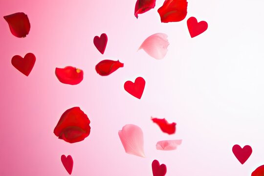 Romantic background with falling red rose petals and heart shaped confetti on pink gradient