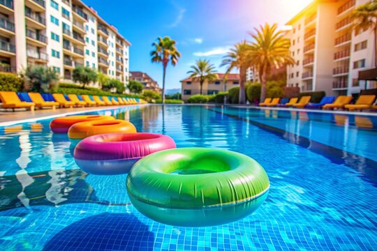 Inflatable pool ring floating in backyard swimming pool on sunny day