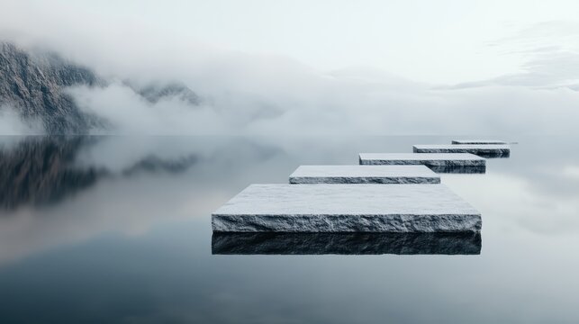 A surreal landscape featuring floating stone platforms atop a smooth reflective surface, shrouded in fog, creating a dreamlike atmosphere that evokes serenity and wonder.