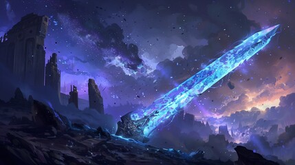 Giant metal key penetrating a surreal floating rock island with ancient moss covered ruins