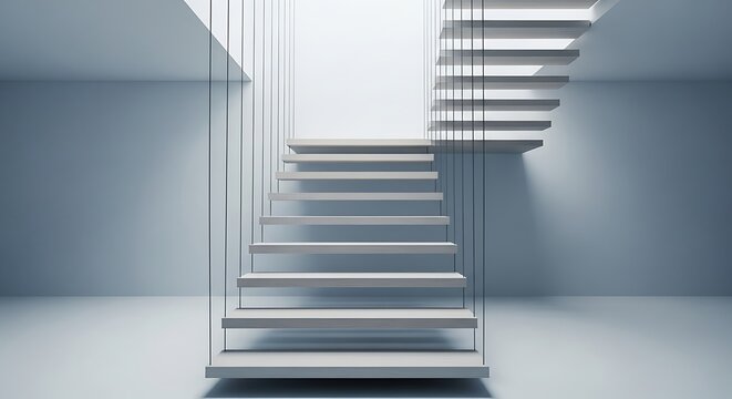 Modern minimalist floating staircase in a bright, clean architectural interior with white walls and subtle shadows.
