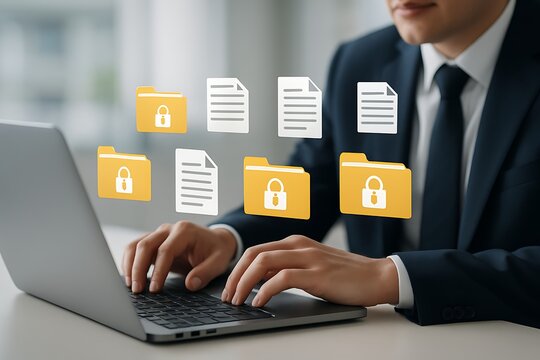 Businessman working on laptop with floating secure folder and document icons representing data protection privacy encryption and safe digital file management in corporate cybersecurity concept