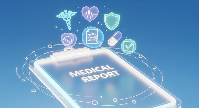 Medical report on a digital device with health icons floating on a blue gradient background design art