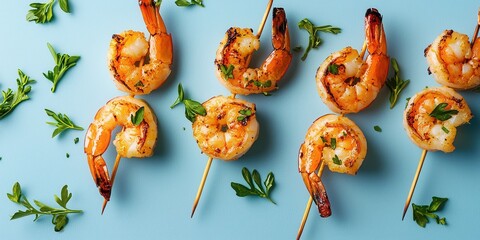 Floating grilled shrimp on skewers with herbs on a soft blue background
