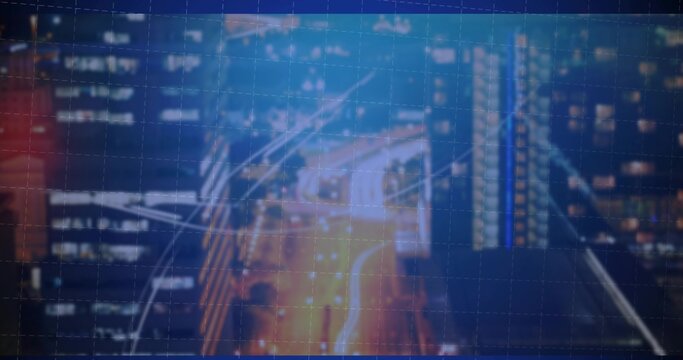 Glowing highway emitting light trails over downtown at night, with code overlays and grid lines