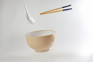 Empty oriental Japanese Chinese soup bowl spoon chopstick elevated flying in air off white