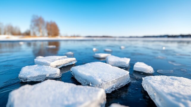 Body of water with ice floating on top. The ice is in the shape of squares. The water is blue