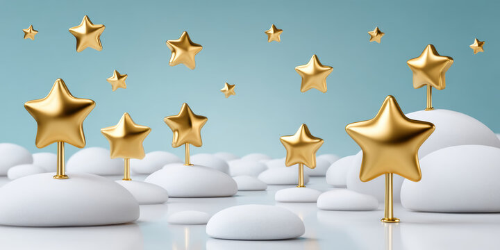 Golden stars floating on white background for festive holiday celebrations