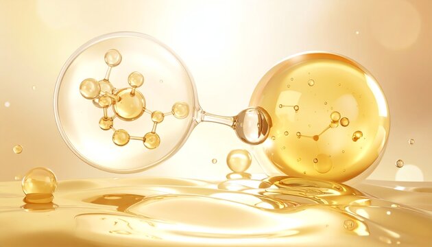 Golden transparent molecular structure background with floating glossy bubbles, abstract science concept, suitable for cosmetic, skincare, or biotech product presentations.