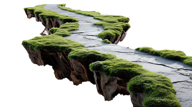Floating Pathway to the Horizon: A serene, stone pathway curves gently through floating land, adorned with vibrant green moss, leading towards an endless horizon. A symbol of journey and discovery.