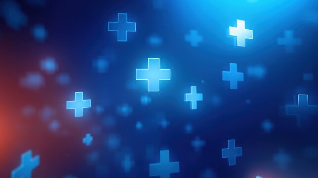 Blue glowing plus symbols floating in a dark vibrant background with a futuristic and calm atmosphere