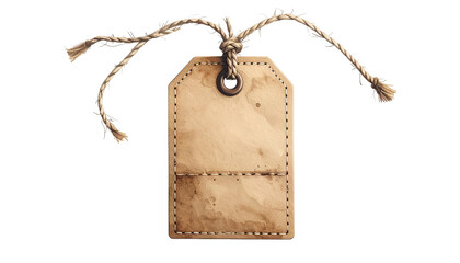 Aged paper tag with a stitched pocket and a textured string, floating against black