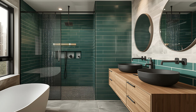 Photorealistic shot of a master bathroom renovation. Walk-in rainfall shower with frameless glass door, emerald green subway tiles, floating oak wood vanity with double vessel sinks