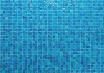 Blue mosaic tiles with water reflections and grout lines