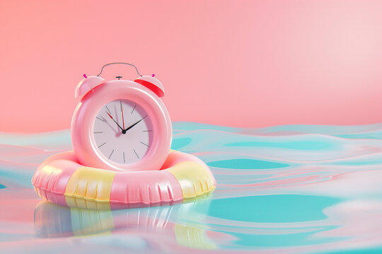 Alarm clock as an inflatable ring floating in the water on pastel background. Minimalist creative concept. Save your time, vacation and safe tourism, summer time, sport, beach, summer vacations theme.