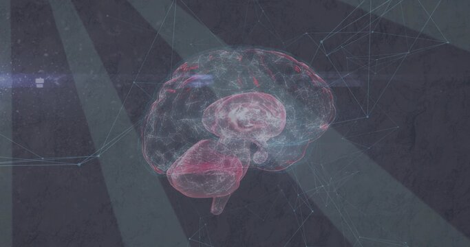 Translucent 3d brain rotating with neural network nodes, dashed guideline and tech infographic