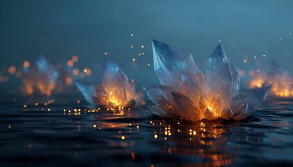 Floral, glowing, translucent shapes resting on soft, ethereal landscape